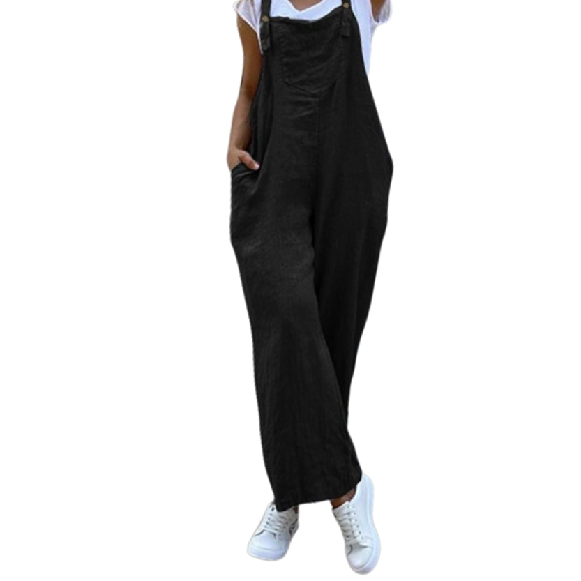 - Sleeveless, backless, summer jumpsuit with suspender buttoned shoulder straps.