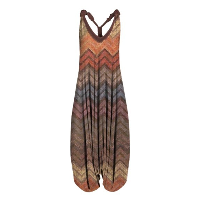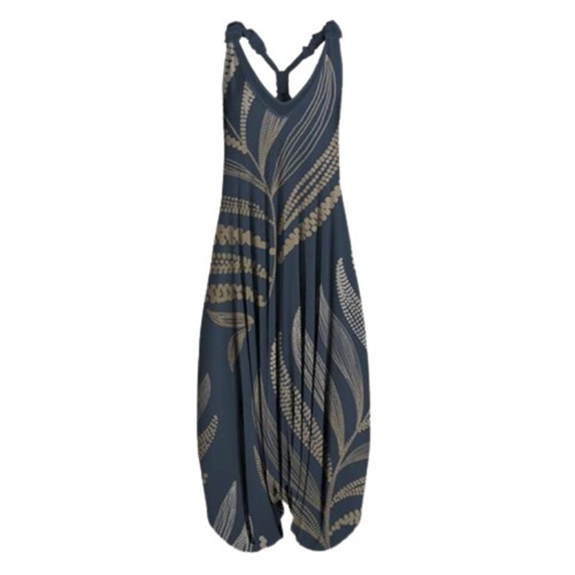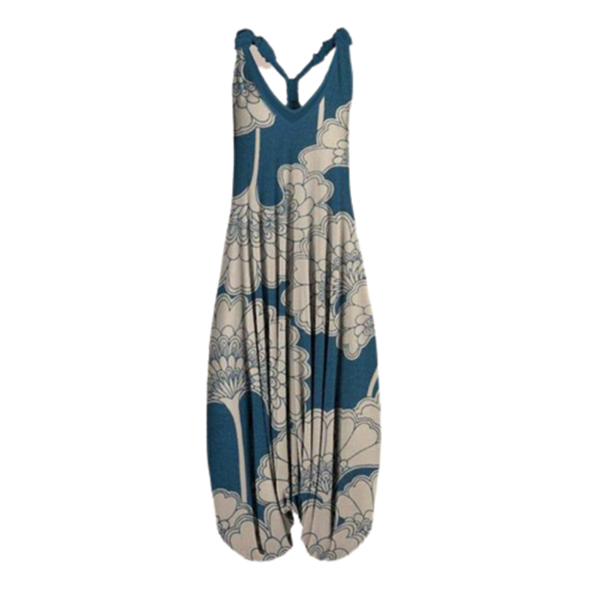 - Sleeveless, backless, summer jumpsuit with halter knotted straps.