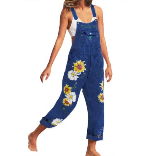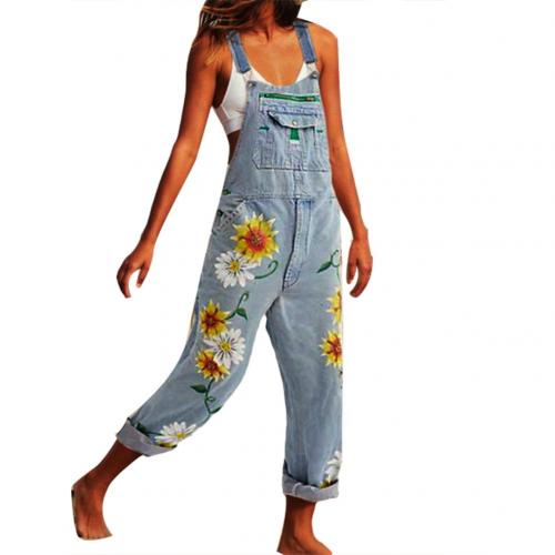 Sunflower Print Women's Fashion Denim Dungarees, Women's Denim Cropped Overalls, Harem Pants, Jeans, Jumpsuits, Large.