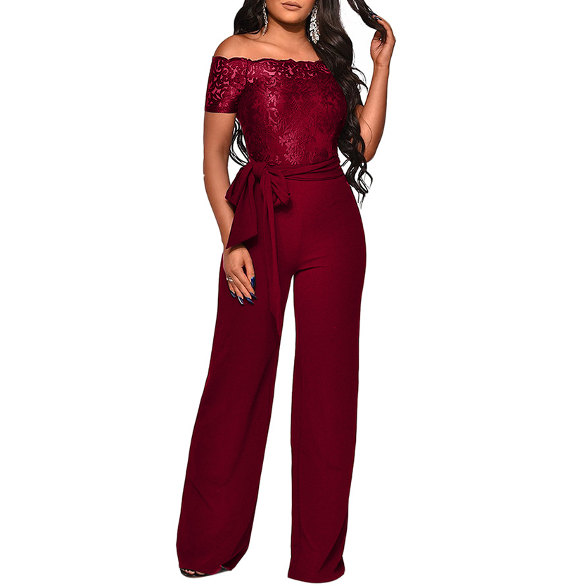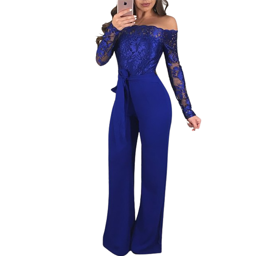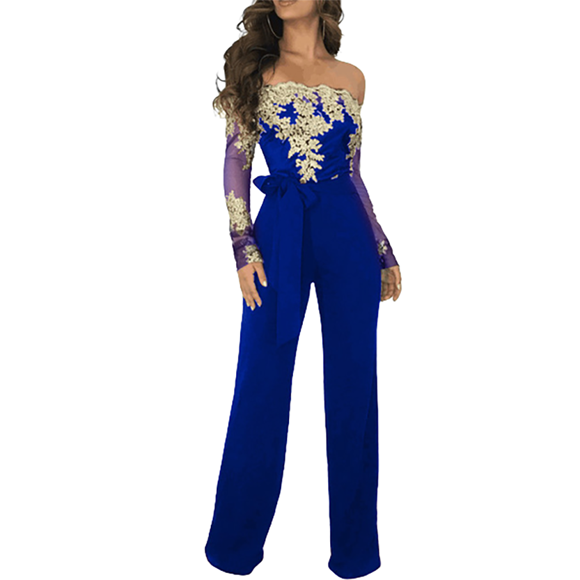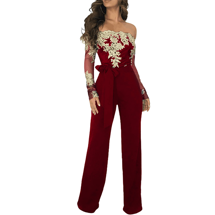 Women's Appliques Lace Patchwork Jumpsuit, Women Sexy Off Shoulder Slash Neck Long Sleeve Women Jumpsuit, Elegant Wide Leg Jumpsuit, Playsuits, Lace Evening Dress, Party Dress, Cocktail Dress, Formal Dress.