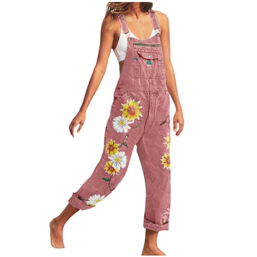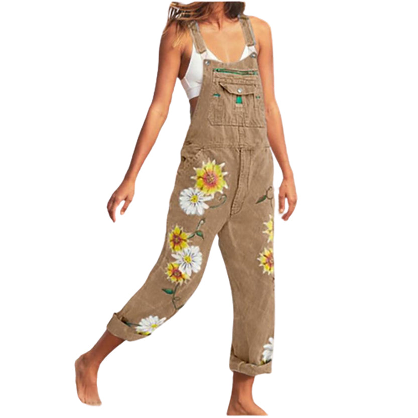 - EMBELLISHMENTS. These classic suspender overalls are finished with a quirky sunflower print on the legs adding some extra color and fun to your outfit.