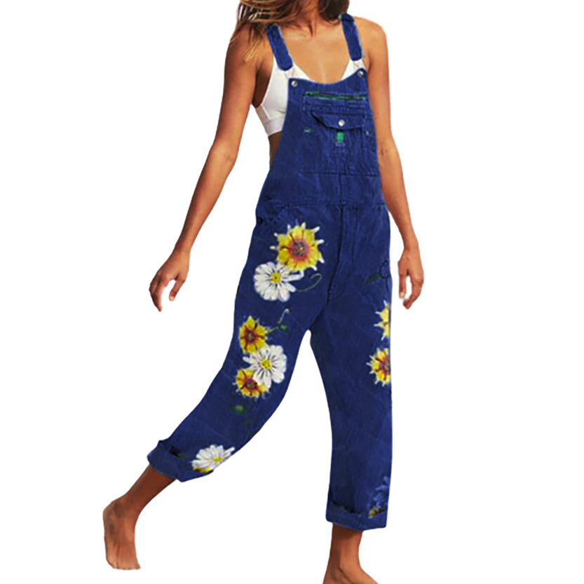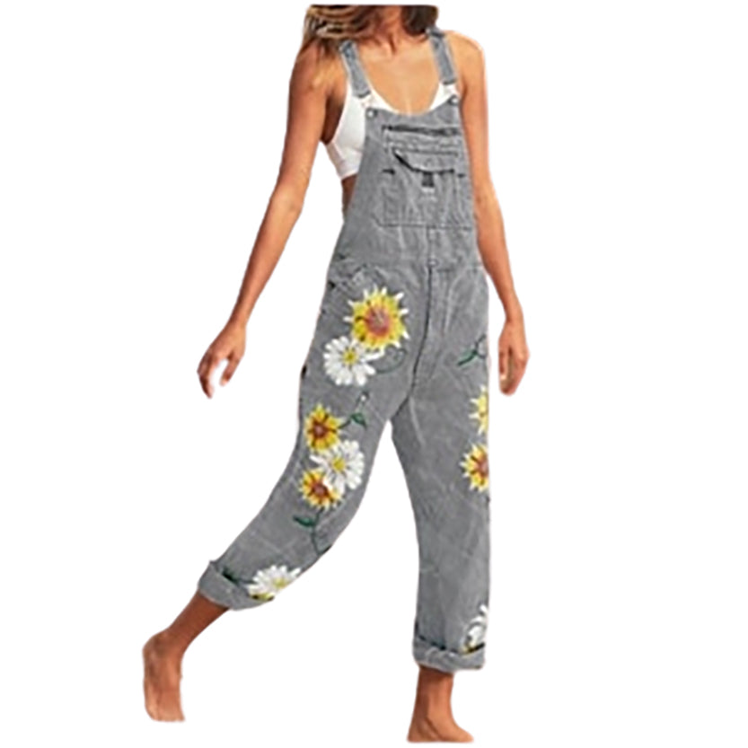 Sunflower Print Women's Fashion Denim Dungarees, Sleeveless, Women's Denim Cropped Overalls, Harem Pants, Jeans, Jumpsuits, Large. Sleeveless, Strap Pockets, Loose Ladies Overalls, Washed, Slim Overalls, Women's Casual Pants.