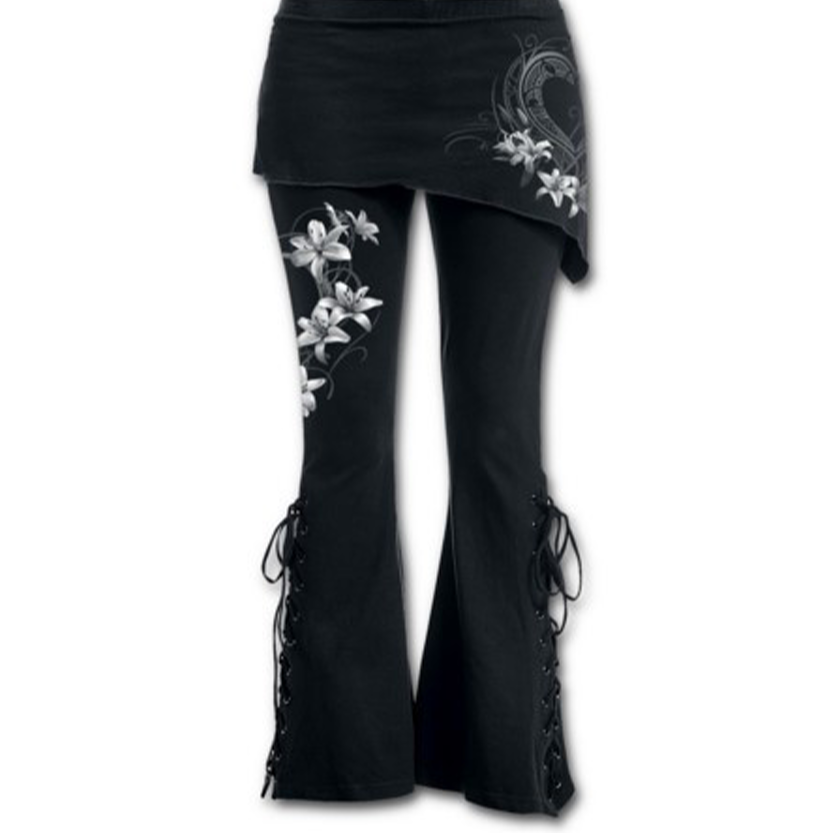 - Featuring pull on closure, lace up side panels at the calf, elasticized stretch material in solid colors, these full-length women's floral print pants are sure to impress.