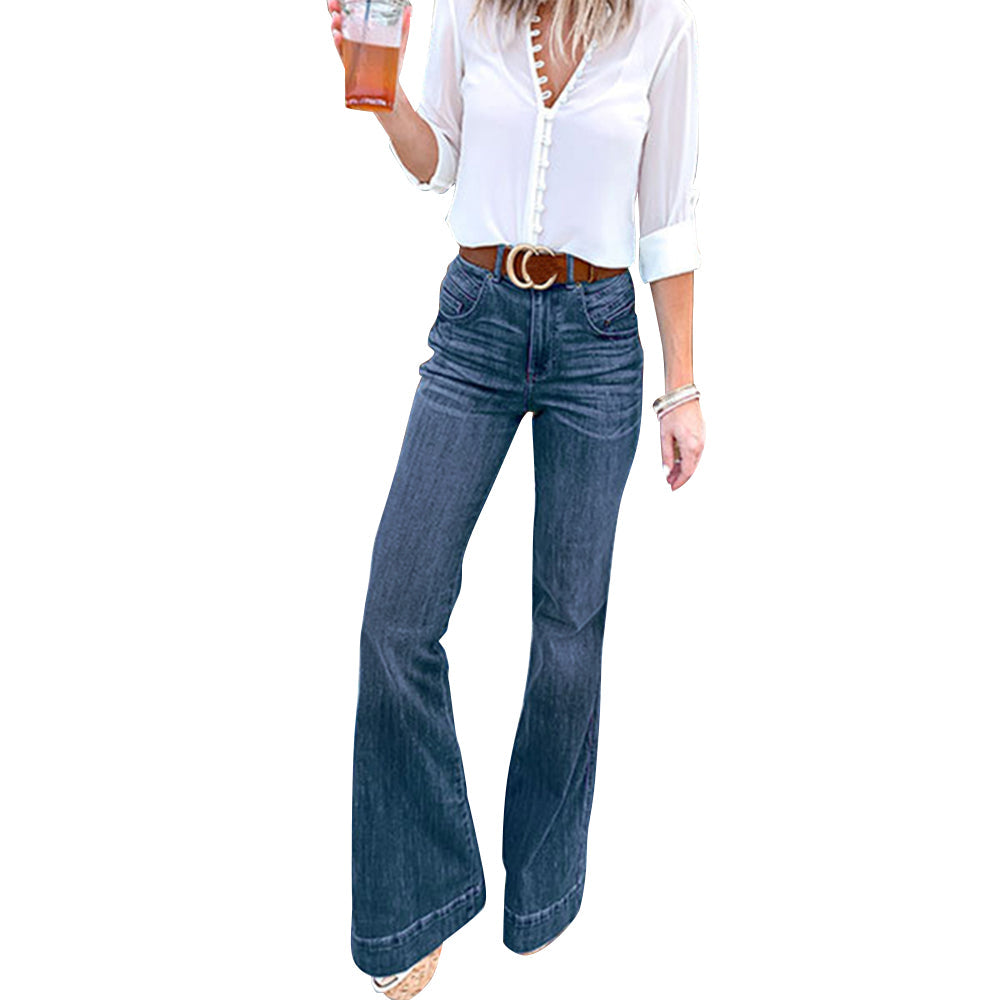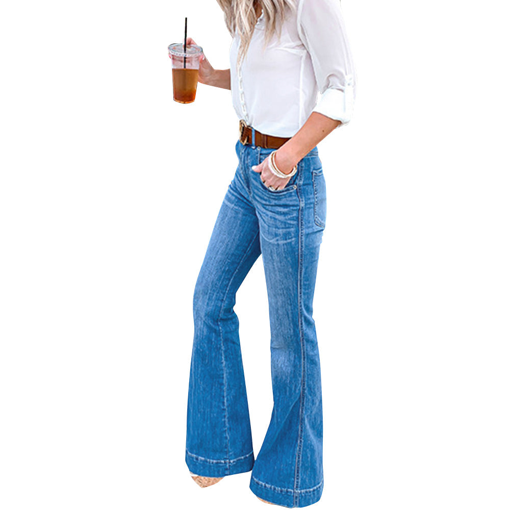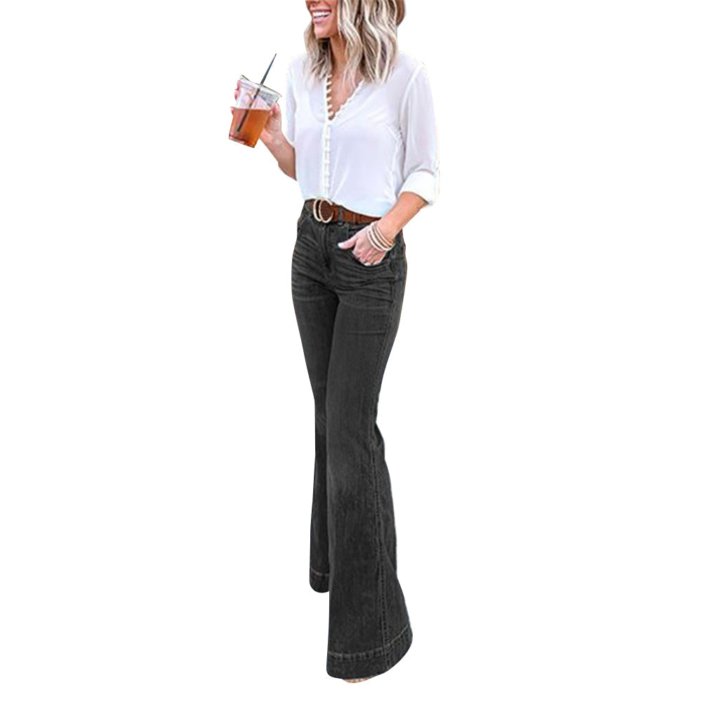 - Vintage flare bell bottom jeans pants, casual stretchy denim pants for women are soft comfortable and form fitting with classic 5-pocket design, zip fly and button closure. These sexy jeans hug your curves and flatter your shape highlighting your charming figure.