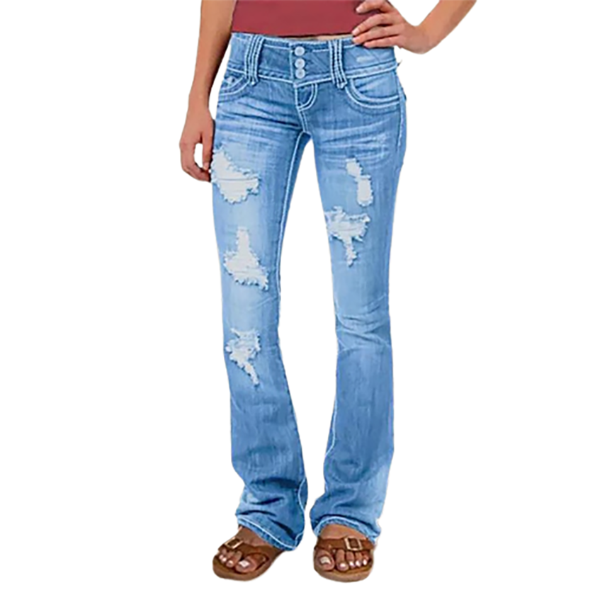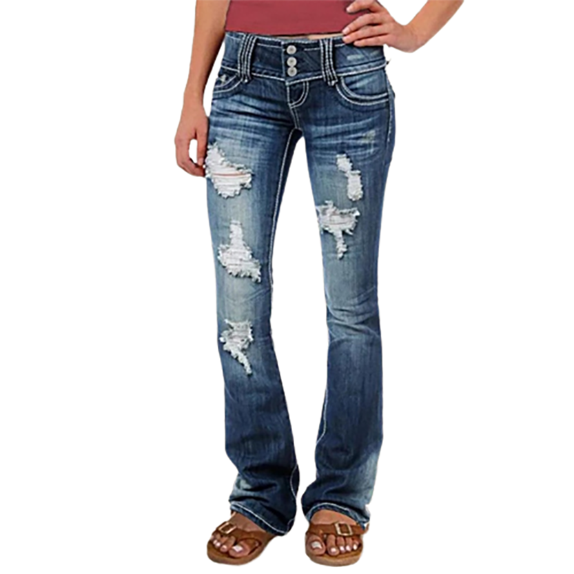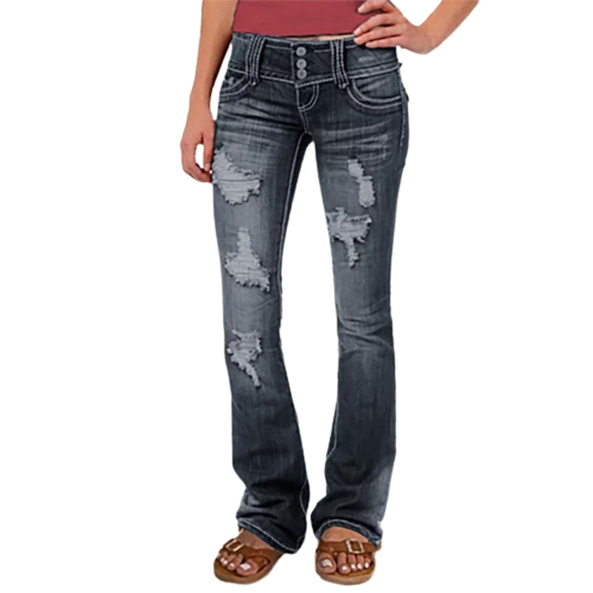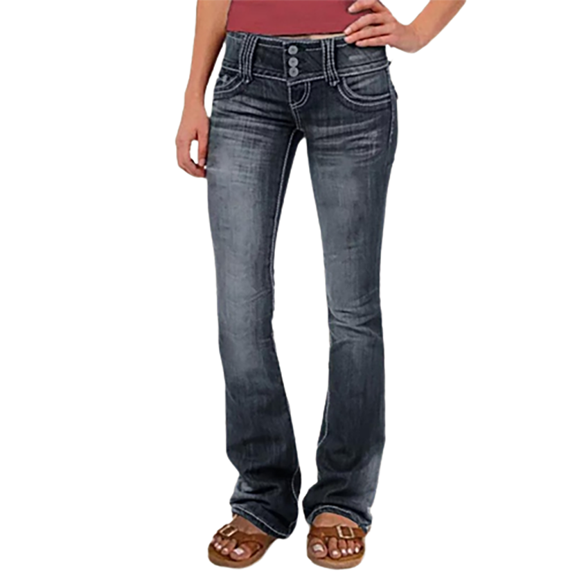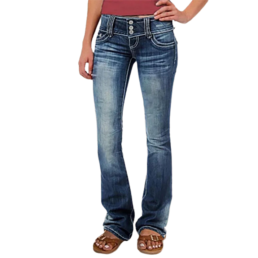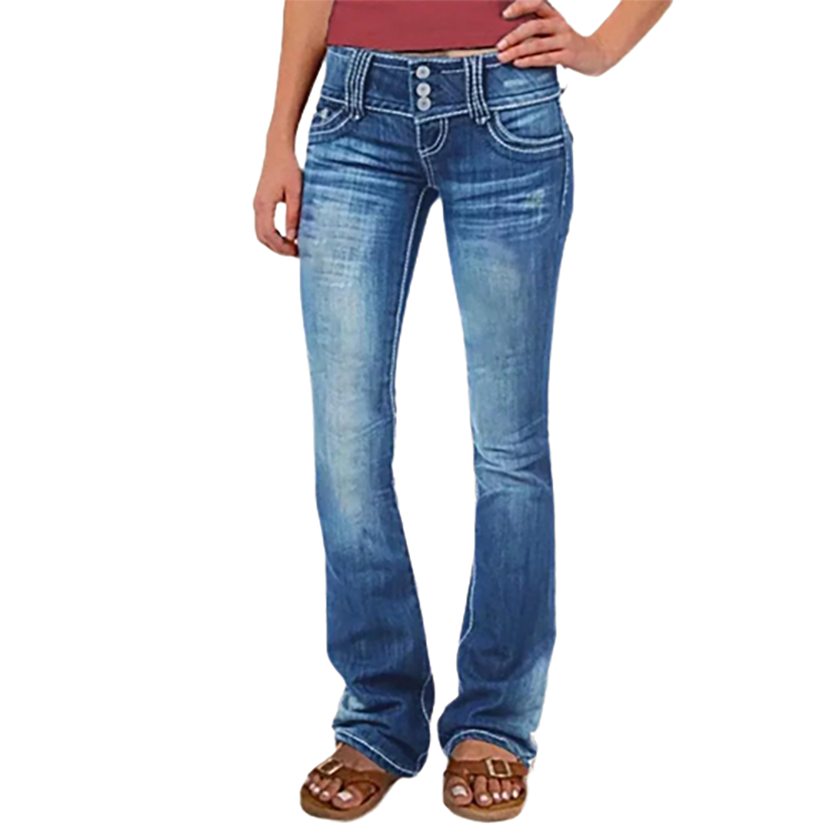 - Vintage bootleg flare jeans pants, casual stretchy denim pants for women are soft comfortable and form fitting with classic 5-pocket design, zip fly and button closure and mid waist. These sexy jeans hug your curves and flatter your shape highlighting your charming figure.
