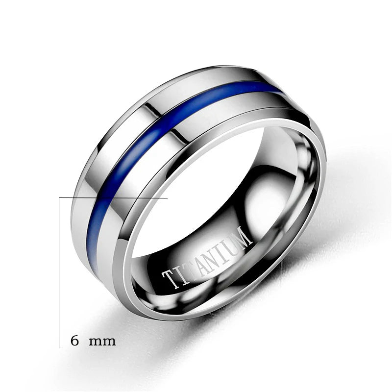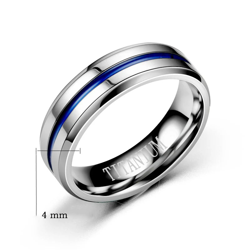 The striking blue middle groove on this silver titanium wedding band ring for men and women adds a touch of simplicity for an elegant, and a sleek look.