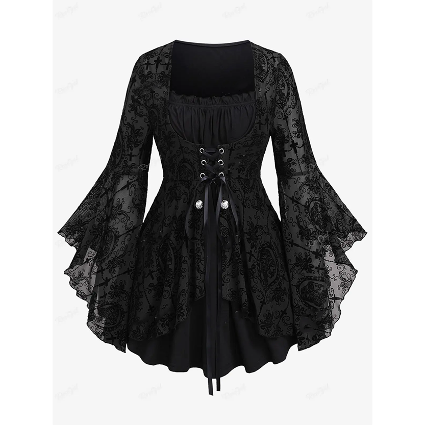 Model Number: Gothic Flocking Cross Flower Pattern Mesh Panel Lace-up Top