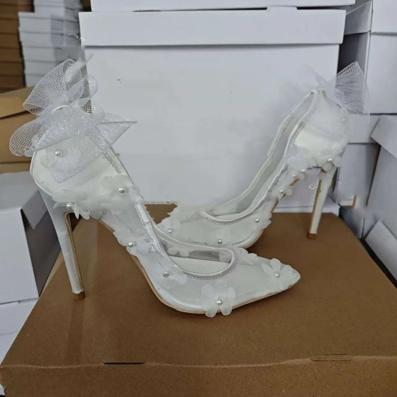 - Featuring floral lace applique mesh design, organza bow, easy slip on and off closure, classic pointed toe, soft inner cushioning for comfort, non-slip, ridged rubber soles, and finely finished with stylish high stiletto heels, these stunning wedding shoes are an easy choice for your formal occasion.