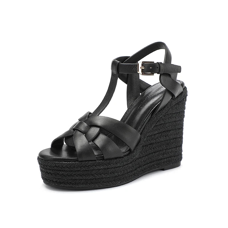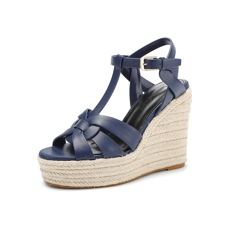 - Featuring cross plait t-bar design, buckle strap closure, thin elegant ankle strap, round open fish mouth toe, soft inner cushioning for comfort, seam detailing, non-slip ridged rubber soles, and finely finished with high hessian wedge heels, these cool summer sandals make an easy choice for any occasion.