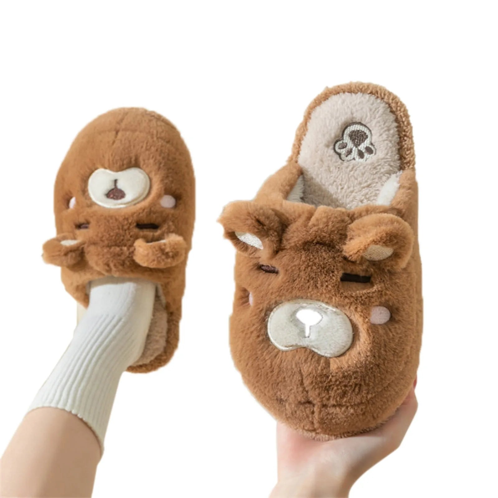 These toasty warm super cute slippers are perfect for lounging around the house or slipping on after a refreshing shower. Made from high quality plush materials and featuring cute animal face design with non-slip ridged soles, easy slip on and off closure, and low flat heel these sweet house slippers are perfect for snuggling up on cold chilly nights. Great couples slippers and an ideal gift for a loved one. Available in 2 colors, Brown and Ivory for your convenience.