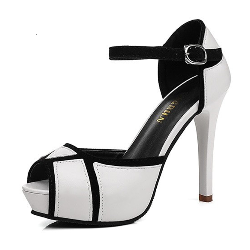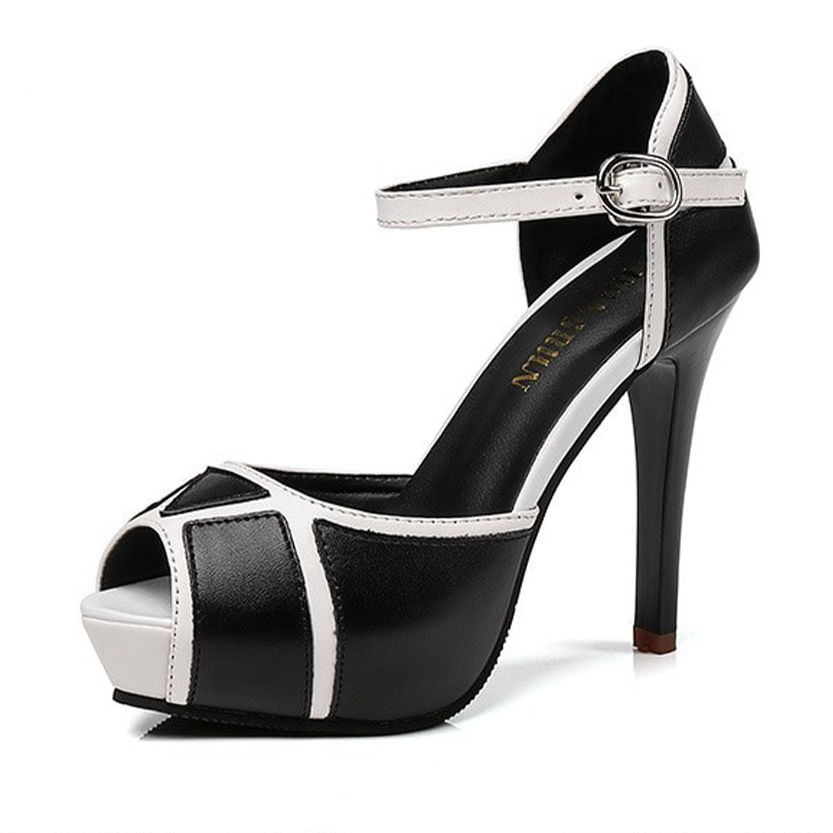 - These beautiful PU patent leather stilettos ooze charm and sophistication with their classic open toe, elegant two tone color design, buckle strap closure, soft cushioning for comfort, seam detailing and finished with a thin high 10cm heel and non-slip ridged rubber sole making these chic formal shoes an easy choice for any occasion.