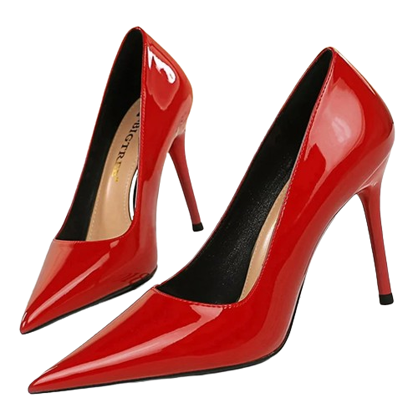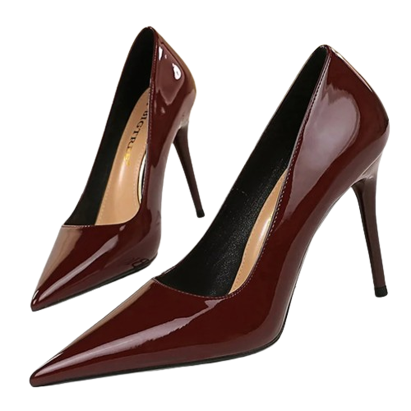- These elegant patent PU leather stilettos ooze charm and sophistication with their classic pointed toe, easy slip on and off design, soft cushioning for comfort, seam detailing and finished with a thin super high 10cm heel and ridged sole making these adorable shoes an easy choice for any occasion.