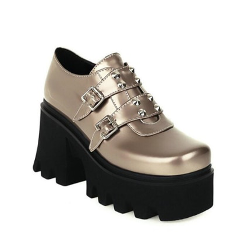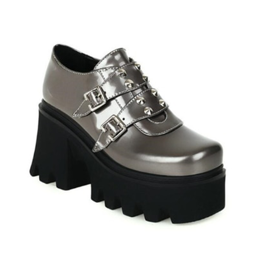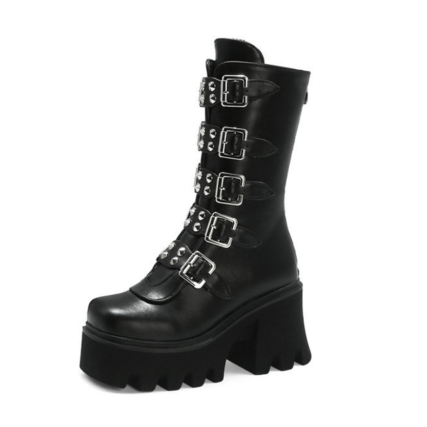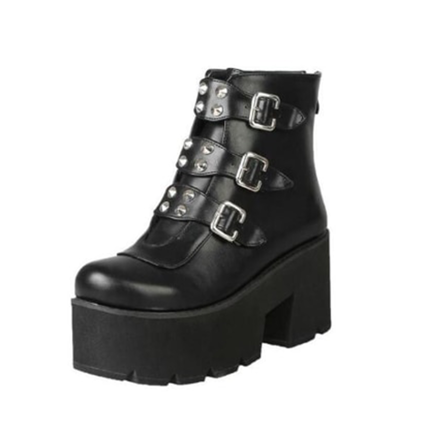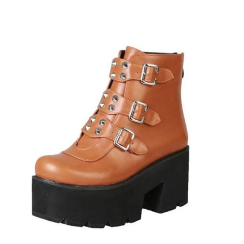 - CHIC DESIGN: Fashion motorcycle boots and platform shoes for women Our fashion women's footwear feature gothic punk design with chunky square platform heels in 3 styles, ankle boot, mid calf boot and wedge shoes, in solid colors of black, light brown, dark brown, grey and gold.