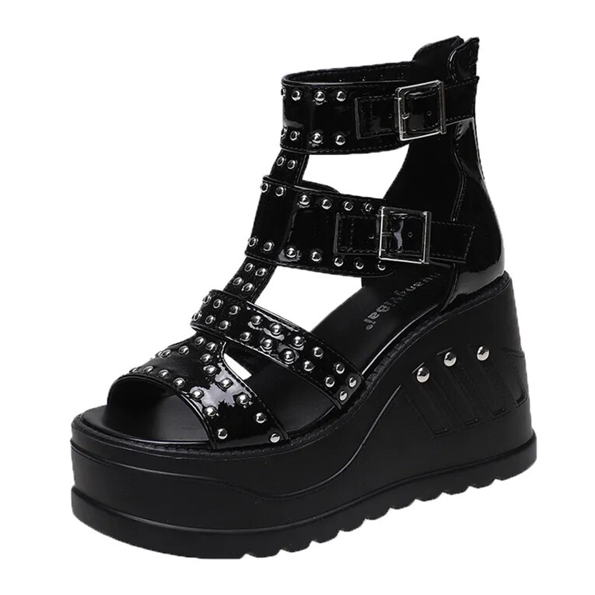- Available in Matte Black and Patent Black and in multiple sizes these fun cute gladiator style sandals will help you to showcase your gothic punk style all summer long.