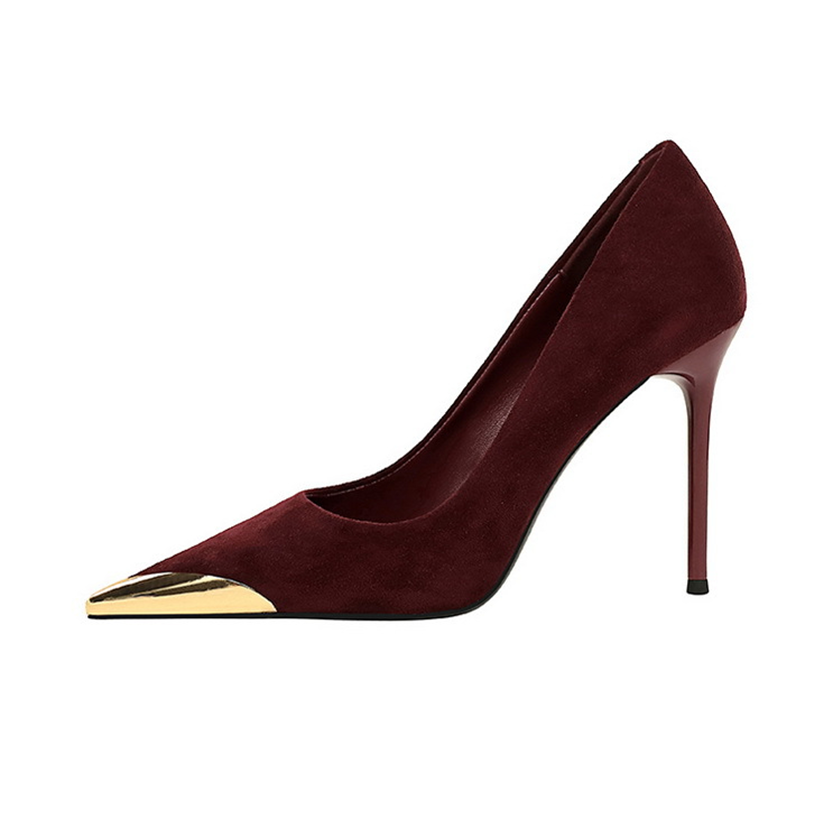 - These beautiful PU Leather, velvet metal stilettos ooze charm and sophistication with their classic pointed toe, stylish decorative metal toe cap and metal heel, easy slip on and off design, soft cushioning for comfort and finished with a thin high heel and ridged sole making these adorable shoes an easy choice for any occasion.
