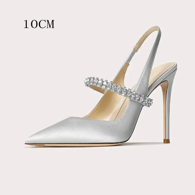 - Featuring, all the glitz and glamor of Hollywood, these stunningly beautiful satin pumps ooze charm and sophisticaiton with their classic pointed toe, easy slip on and off slingback design, capped heels, soft cushioning for comfort, decorative diamante band, thin ankle strap, buckle strap closure and finished with a thin high stiletto heel and anti-slip ridged rubber soles making these adorable formal shoes an easy choice for any occasion.