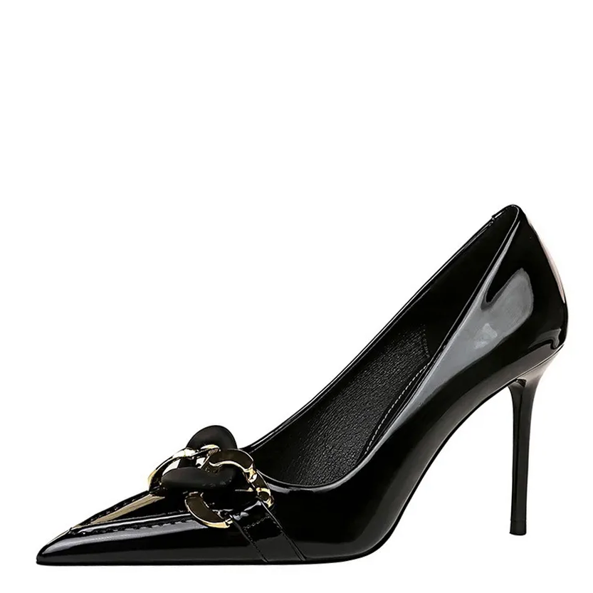 - These beautiful PU patent leather shoes ooze charm and sophistication with their classic pointed toe, easy slip on and off design, decorative metal chain buckle, soft cushioning for comfort, anti-slip ridged rubber sole, seam detailing and finished with thin 3.74" / 9.5cm high stiletto heels make these adorable shoes an easy choice for any occasion.