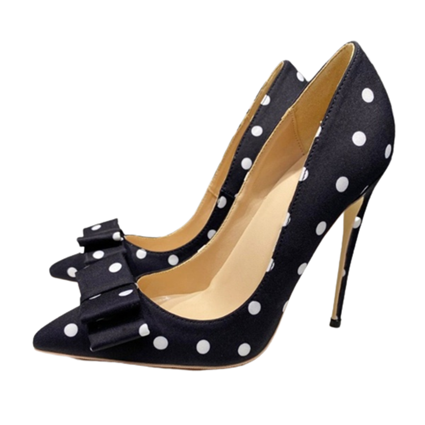 - These beautiful polka dot patterned stilettos ooze charm and sophistication with their classic pointed toe, easy slip on and off design, capped heel, soft cushioning for comfort, seam detailing and finished with a thin high heel and ridged sole making these adorable shoes an easy choice for any occasion.