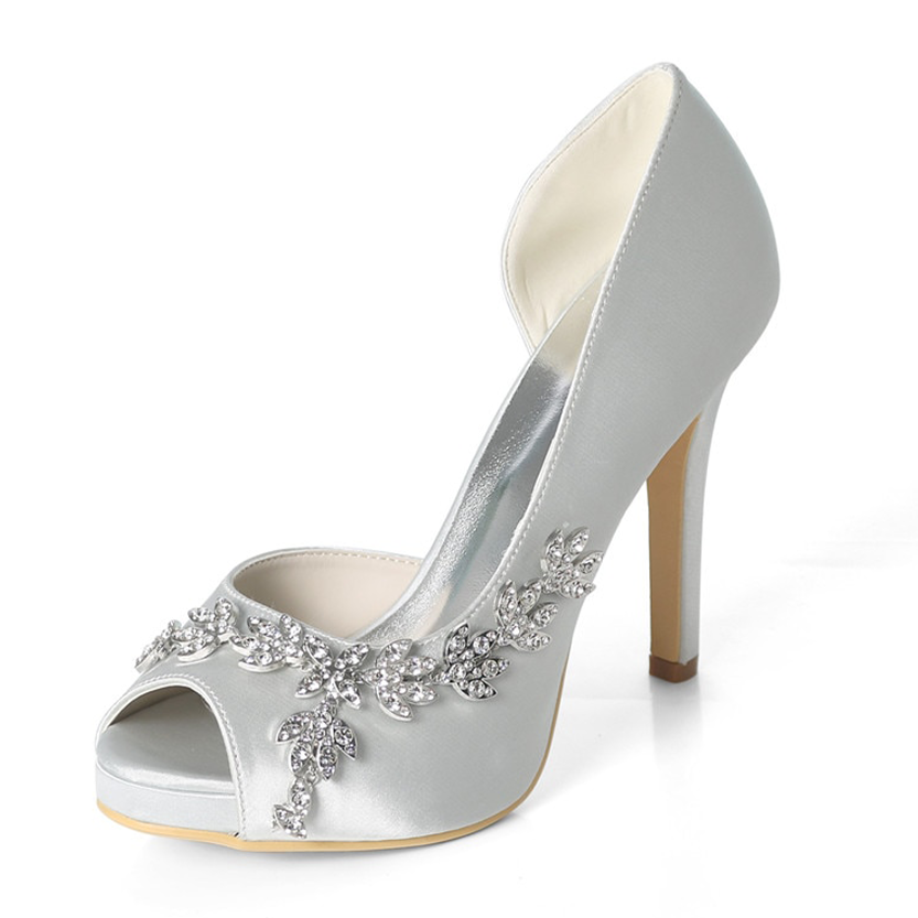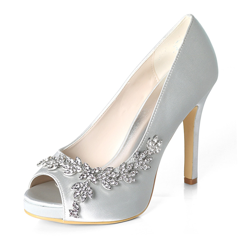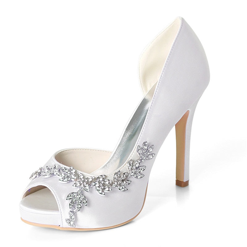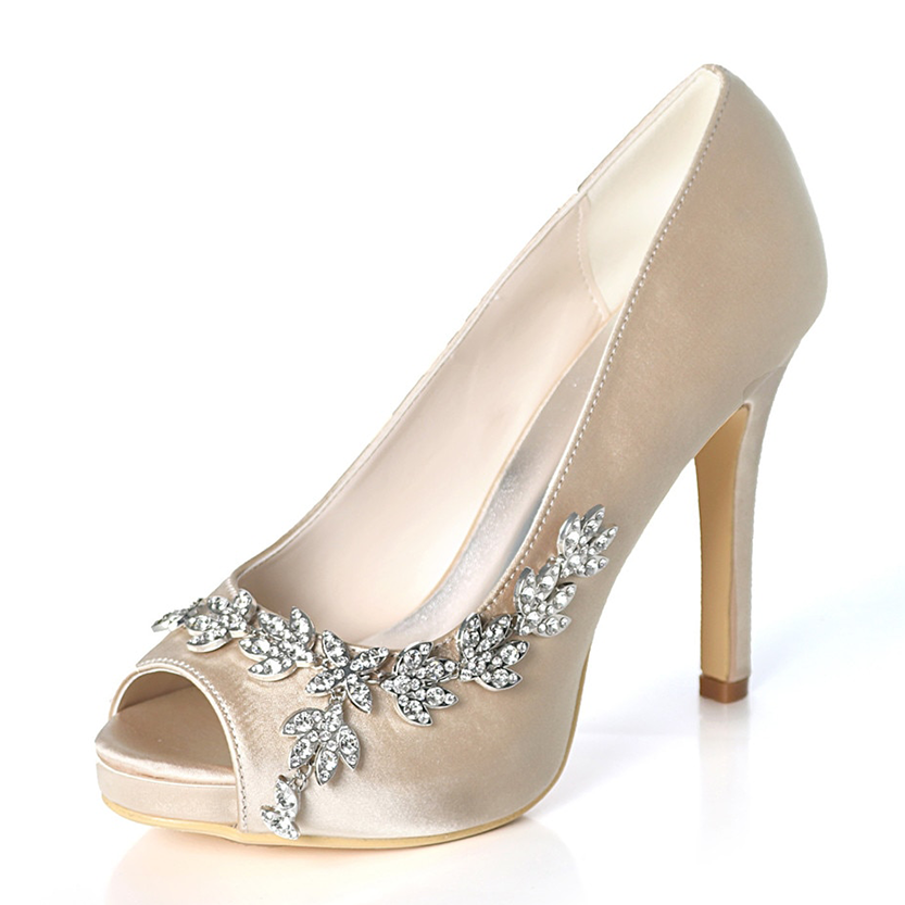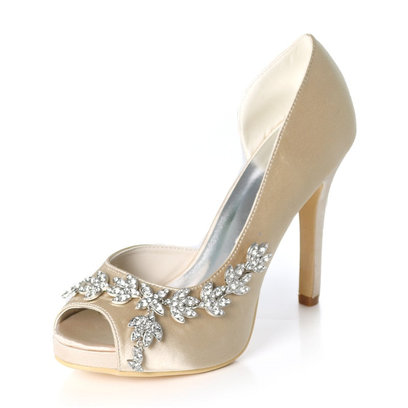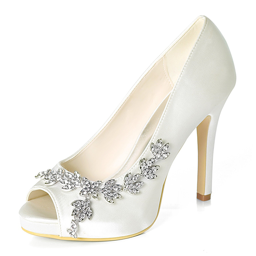 - Featuring sweet rhinestone beading, slip on closure, round peep toe, soft inner cushioning for comfort, seam detailing, non slip, ridged rubber soles, and finely finished with stylish 4.33"/11cm high stiletto heels, these glamorous bridal shoes are an easy choice for any special or formal occasion.