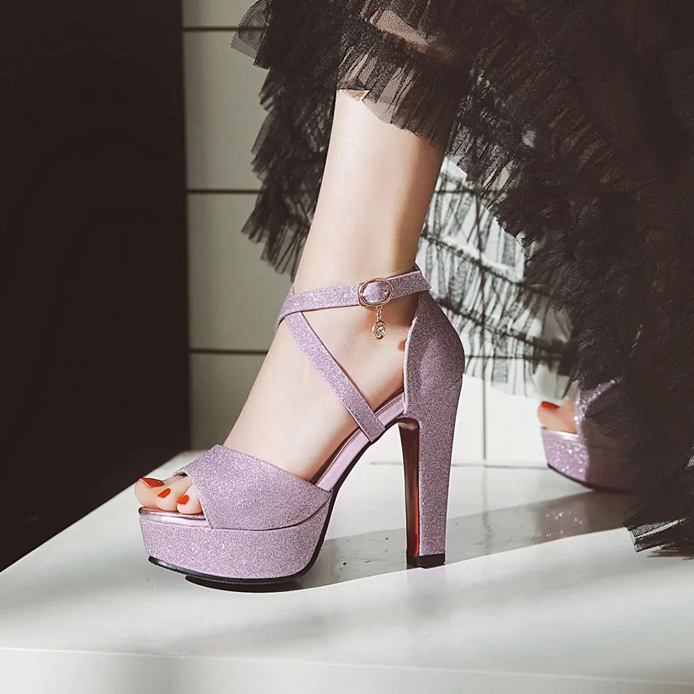 - Featuring shimmering glittery design, bandage straps that cut off just above the ankle, buckle strap and zip up closure, open round toe, soft inner cushioning for comfort, non slip, ridged rubber soles, and finely finished with stylish block stiletto heels, these chic party sandals are an easy choice for any occasion.