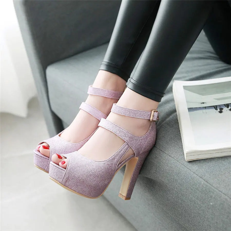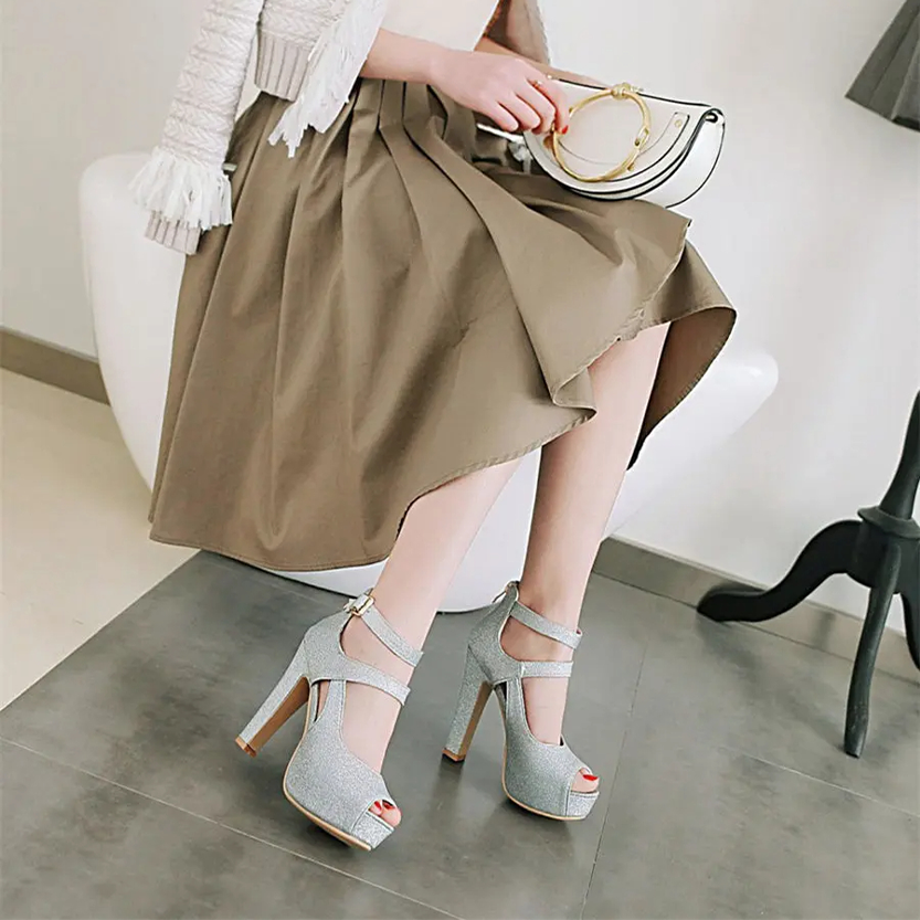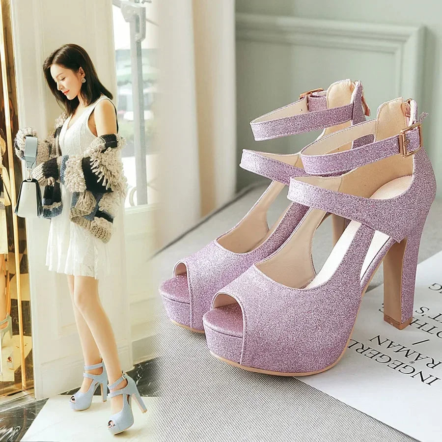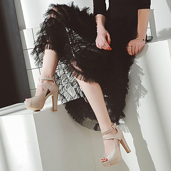- Featuring shimmering glittery design, bandage straps that cut off just above the ankle, buckle strap and zip up closure, open round toe, soft inner cushioning for comfort, non slip, ridged rubber soles, and finely finished with stylish block stiletto heels, these chic party sandals are an easy choice for any occasion.