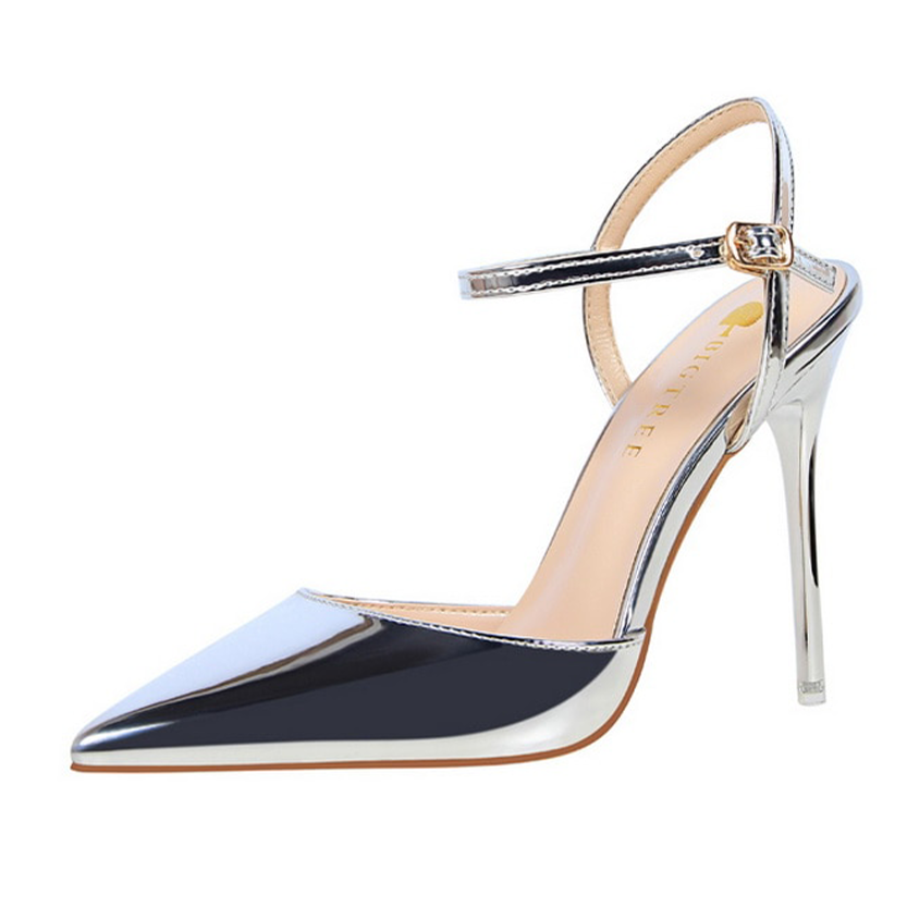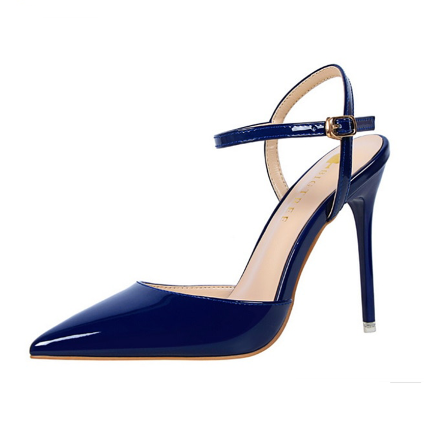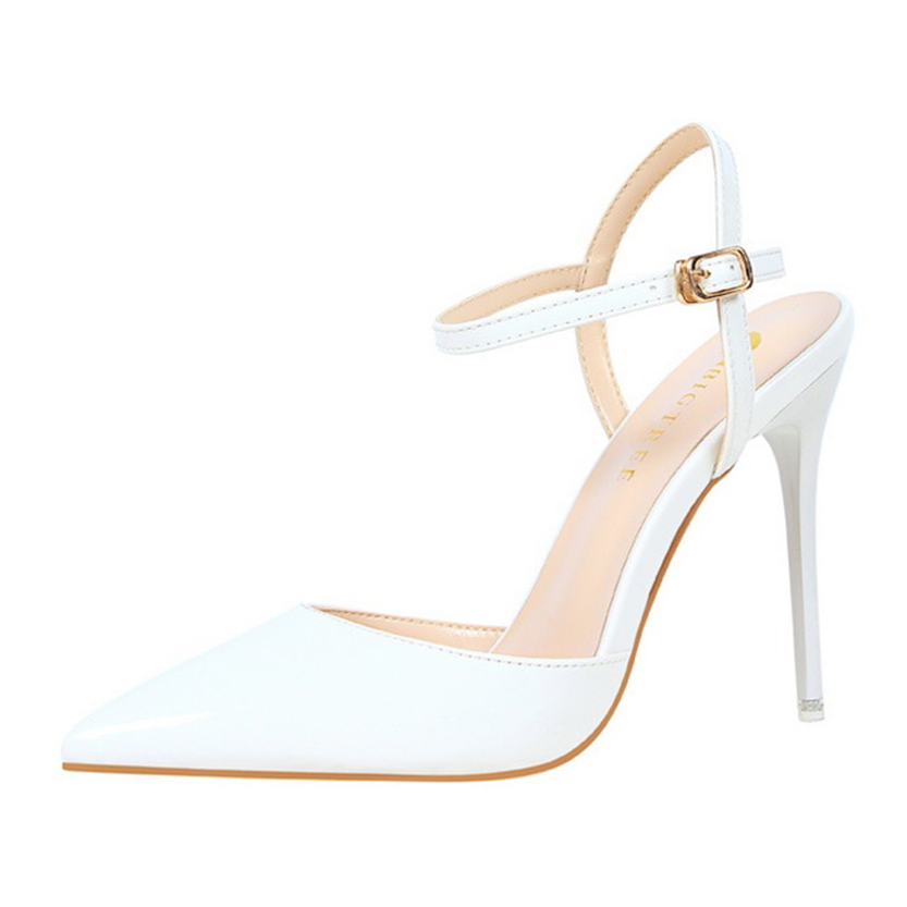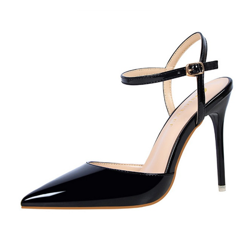 - These beautiful PU patent leather stilettos ooze charm and sophistication with their classic pointed toe, elegant thin t-strap design, buckle strap closure, soft cushioning for comfort, seam detailing and finished with a thin high 10cm heel and non-slip ridged rubber sole making these chic formal shoes an easy choice for any occasion.
