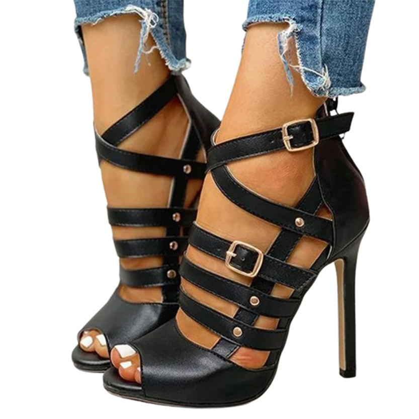 - Featuring a classic gladiator roman strap design that is cropped above the ankle, elegant open toe, easy slip on and off access with multiple buckle straps and finished with high thin square stiletto heels and ridged rubber sole, these chic stylish shoes make an easy choice for any occasion.