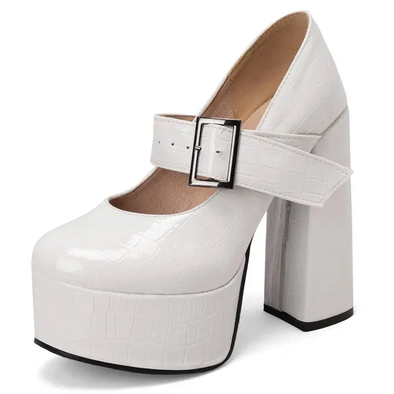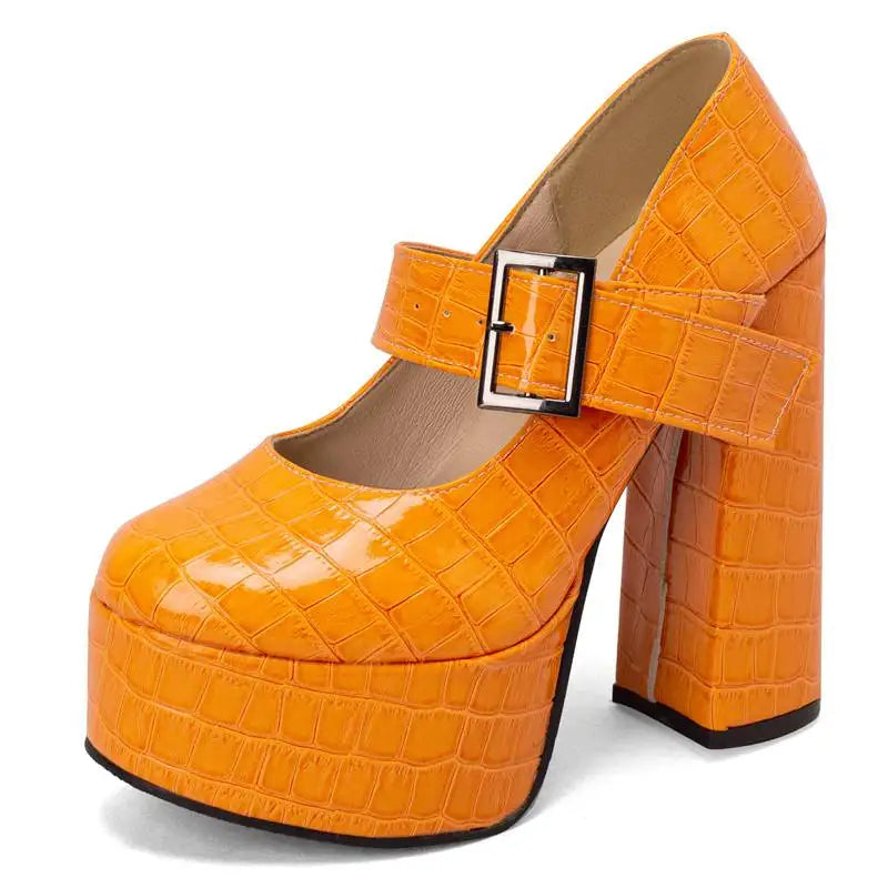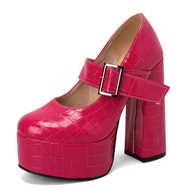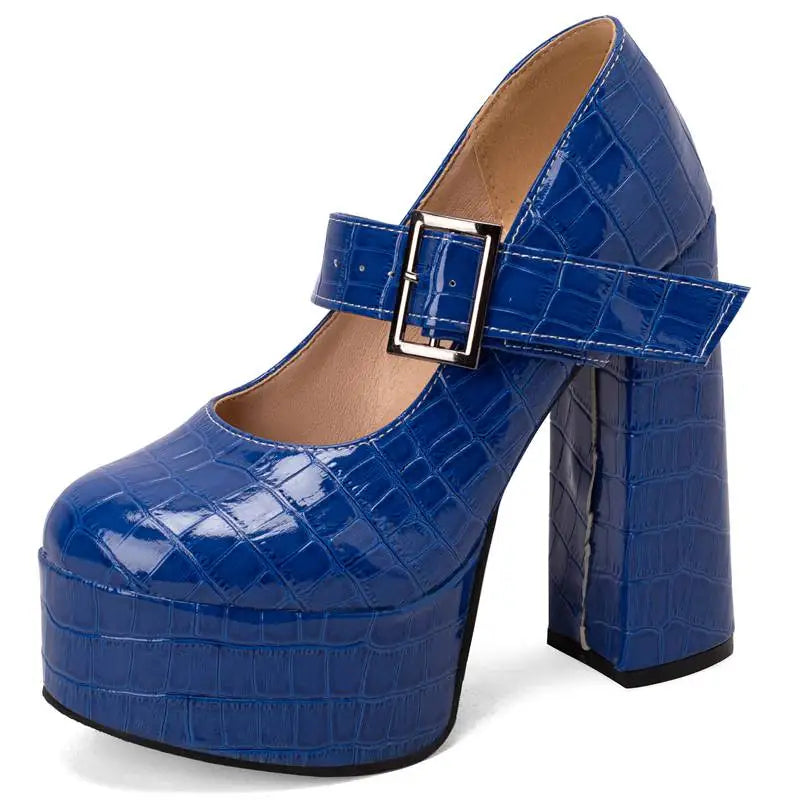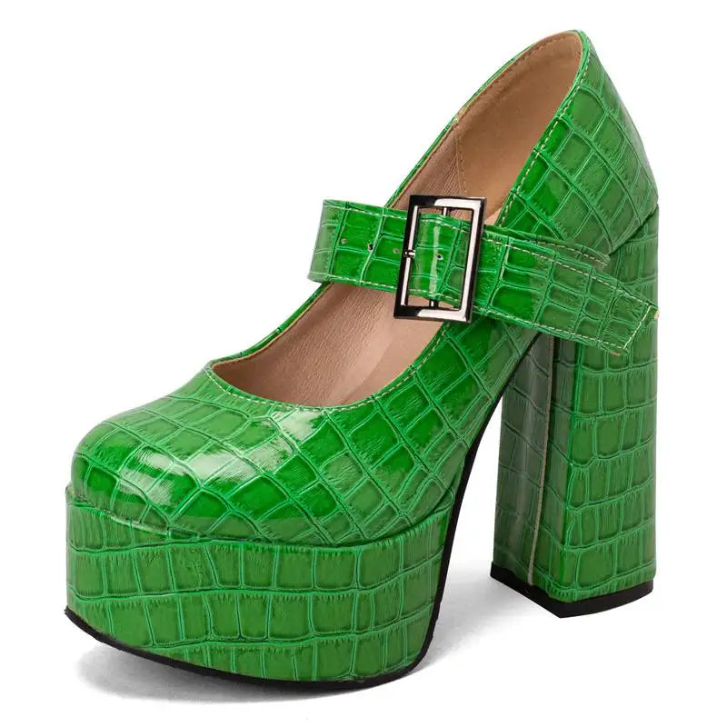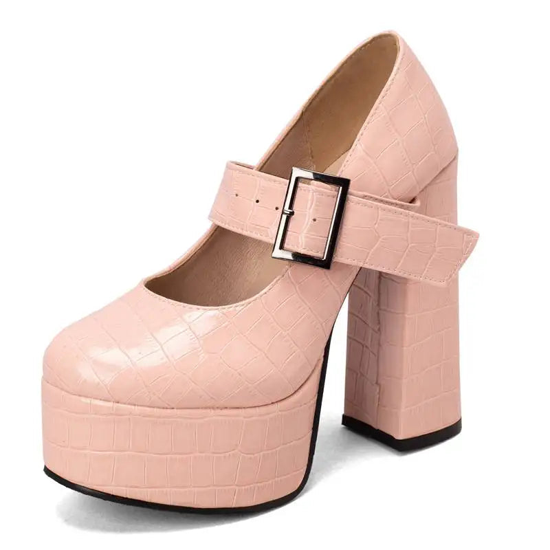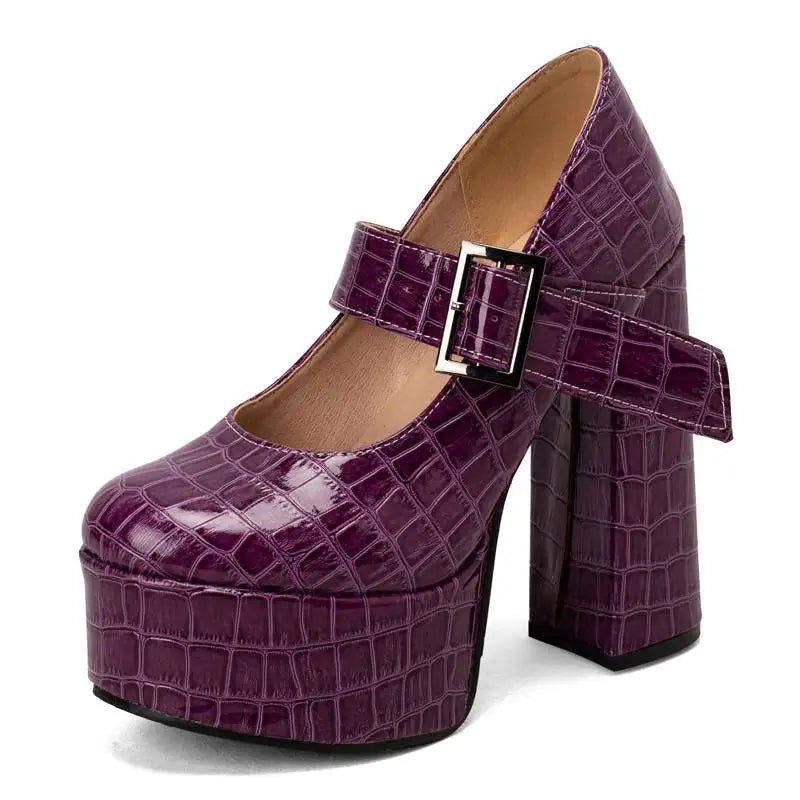 - Made from quality faux PU leather and featuring stone / alligator print design, chunky square heel, anti-skid platform soles, round toes, buckle clasp, seam detailing and soft cushioning. These Mary Jane, Lolita style shoes will be sure to please.