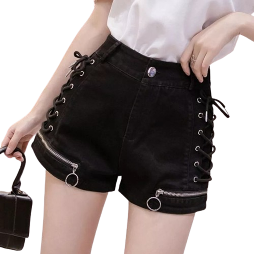 - Featuring a high waist with adjustable lace up sides, zip fly and button closure, belt loops, back pockets, ring pull zips in front, turned up hem, small fit, slight stretch material, these striking high rise summer bandage shorts are a great way to show off your own individual flare and personality.