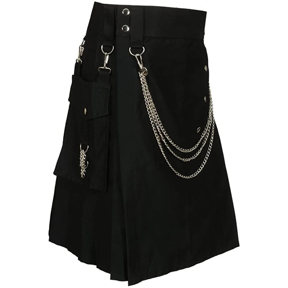 - Featuring Scottish and Irish Kilt design these Warrior Cargo Utility Kilts combine; classic drop waist A line pleated skirt, flat front panel, side split, wide waist band, soft durable fabric that falls gently from the hips, belt loops, buckle strap, stud fasteners, zip up closure, side pocket, decorative rivets, chains and buttons, calf-length free flowing hemline in solid black, these distinctive gentlemen's highland kilts will certainly make you stand out from the crowd!