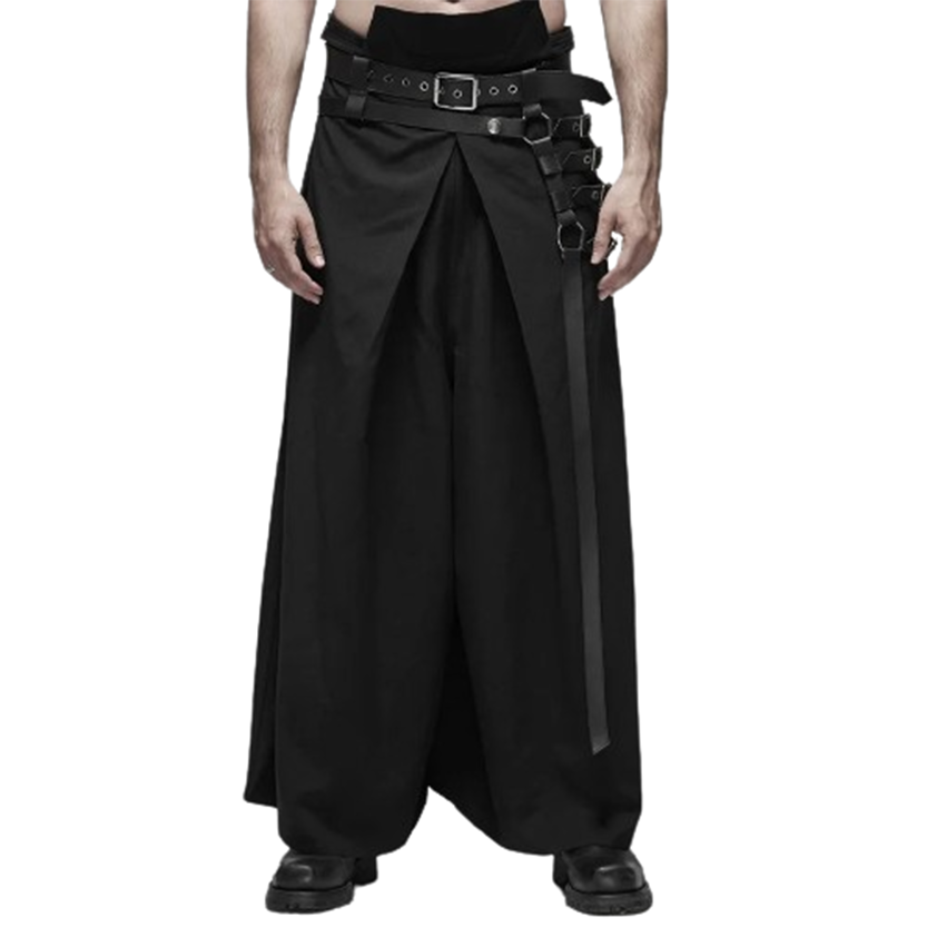 • Featuring full length, wrap-style half skirt, wide leg pant with zipper fly closure, removable buckle strap waist belt, in bold black soft fabric that falls gently from the hips, these one-off men's Gothic punk pant skirts will certainly make you stand out from the crowd!