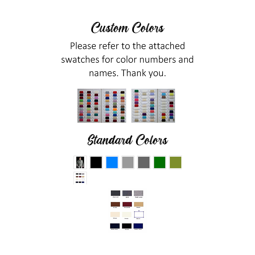 - Availability - Assorted colors, sizes and styles to choose from. Custom made to order or standard sizing available for your convenience. Should you require images of actual color swatch please contact us.