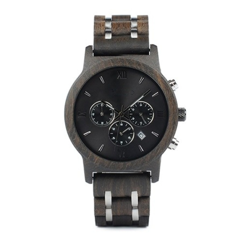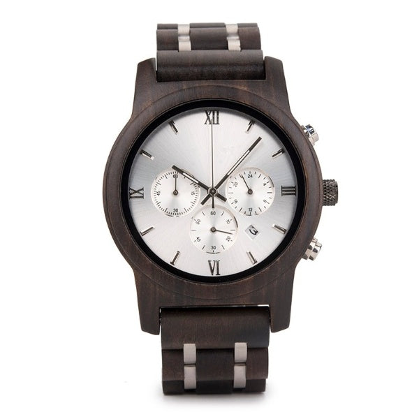 Fashion Quartz Watch, Men's Wooden Watches Business, Casual Wristwatches, Stylish Ebony Wood and Stainless Steel Men's Watch, Combined Chronograph.