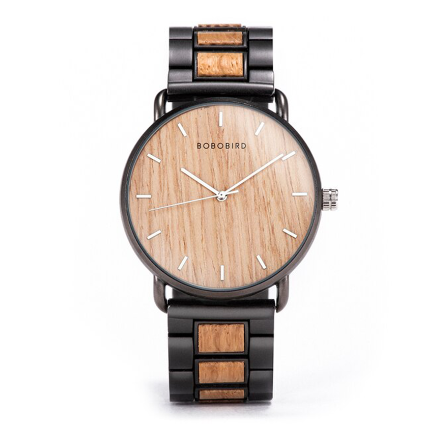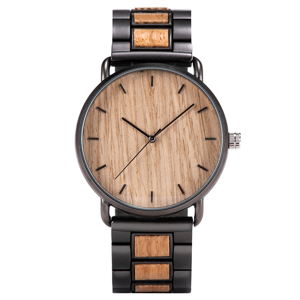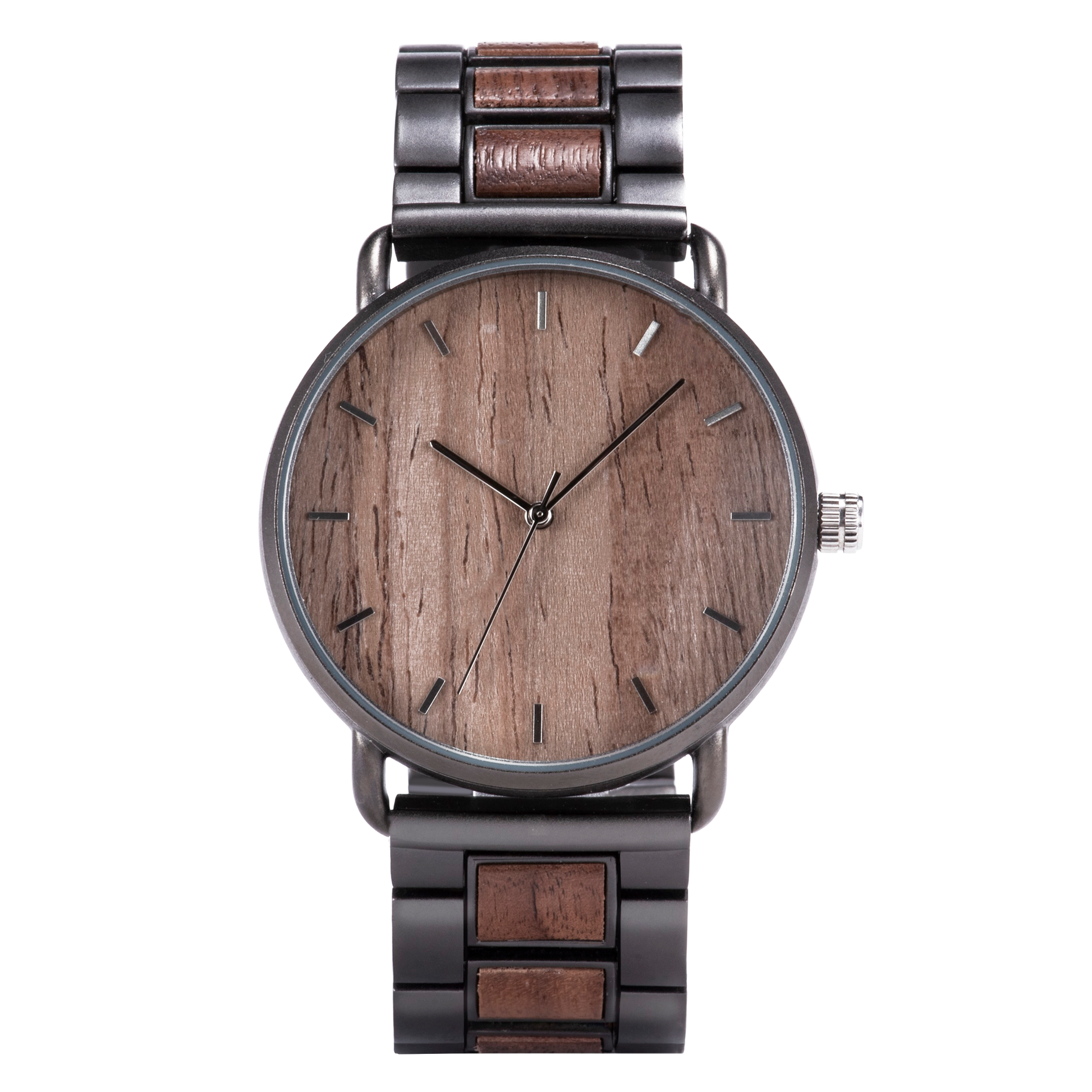- Stainless Steel & Wood: Stainless steel case with wood and stainless steel face and band. This minimal design captures the natural essence of traditional natural wood, with a light, subtle aroma and flexi glass front for protection.